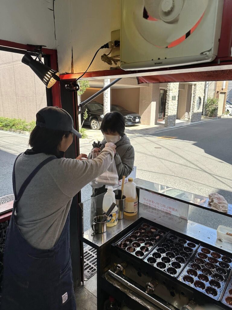 併せて、たこ焼きの販売研修も実施します。お客様の前でたこ焼きを焼き、ソースを塗り、出来立てを直接お渡しすることで、実践的な経験を積んでいただきます。この研修を通じて、プロとしての自覚が大きく芽生えることを期待しています。