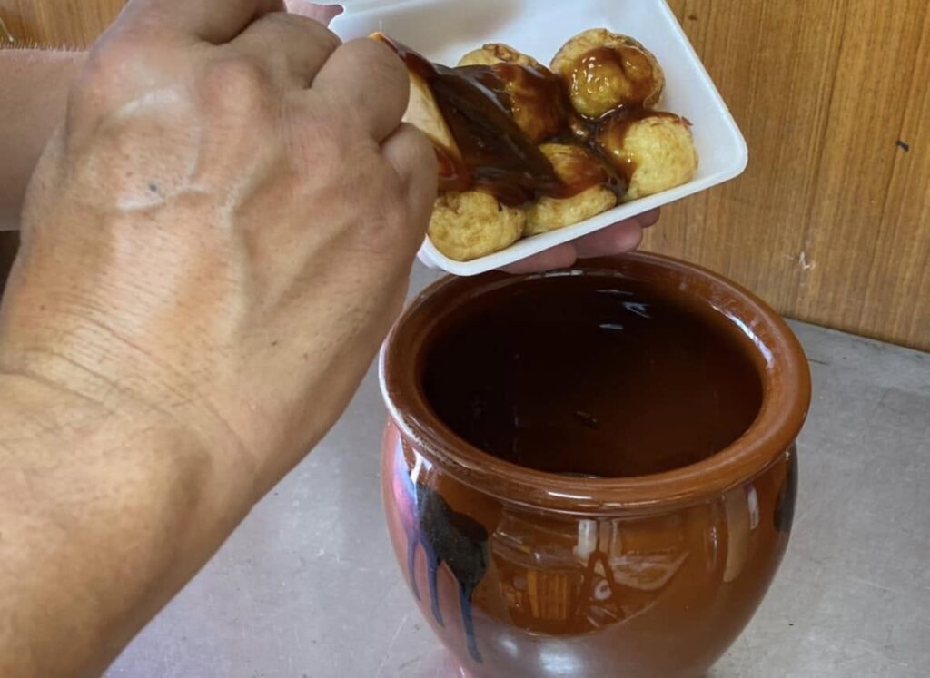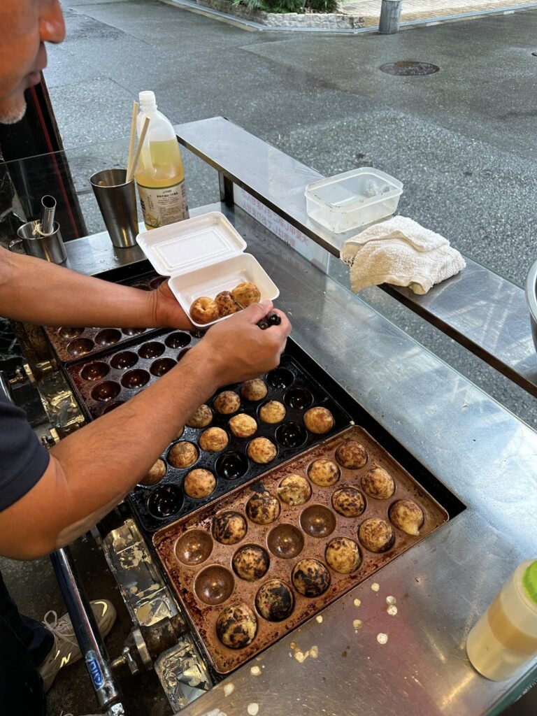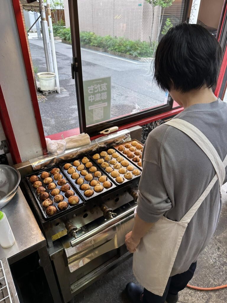 併せて、たこ焼きの販売研修も実施します。お客様の前でたこ焼きを焼き、ソースを塗り、出来立てを直接お渡しすることで、実践的な経験を積んでいただきます。この研修を通じて、プロとしての自覚が大きく芽生えることを期待しています。